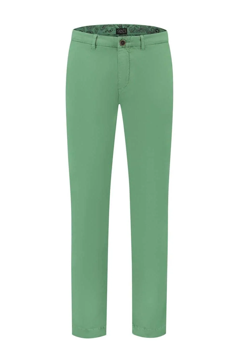 Frisse groene chino met katoen-stretchmix, comfortabel en veelzijdig.