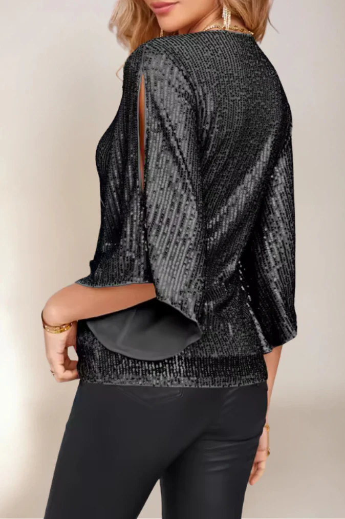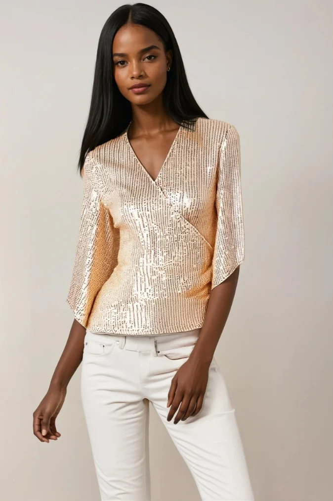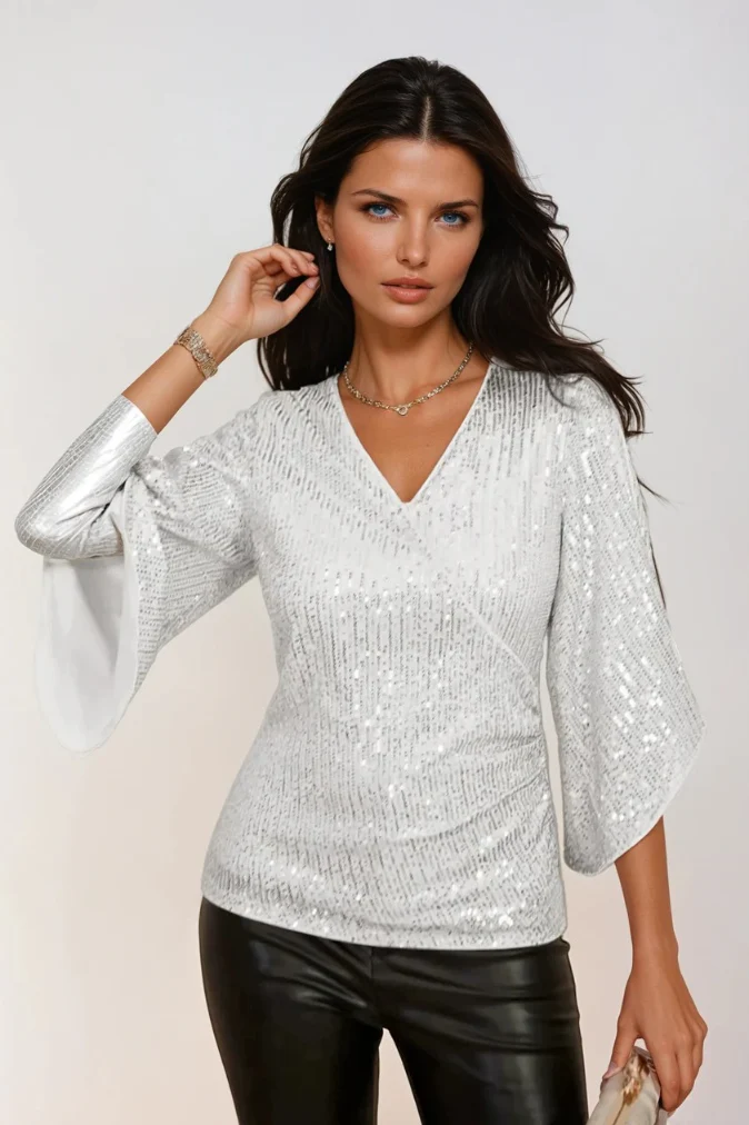 Met zijn glinsterende stof en elegante wrap-design, biedt deze blouse een perfecte combinatie van glamour en comfort. De vloeiende bell mouwen voegen een vleugje luxe toe, waardoor je er altijd chic uitziet, of je nu overdag of ’s avonds uitgaat.