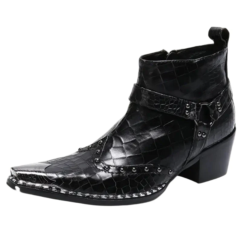 Met een opvallend ontwerp en een comfortabele voering zijn deze cowboylaarzen perfect voor elke gelegenheid. De ritsen maken het aan- en uittrekken eenvoudig, terwijl de krokodillenprint en studs een gedurfde uitstraling geven.