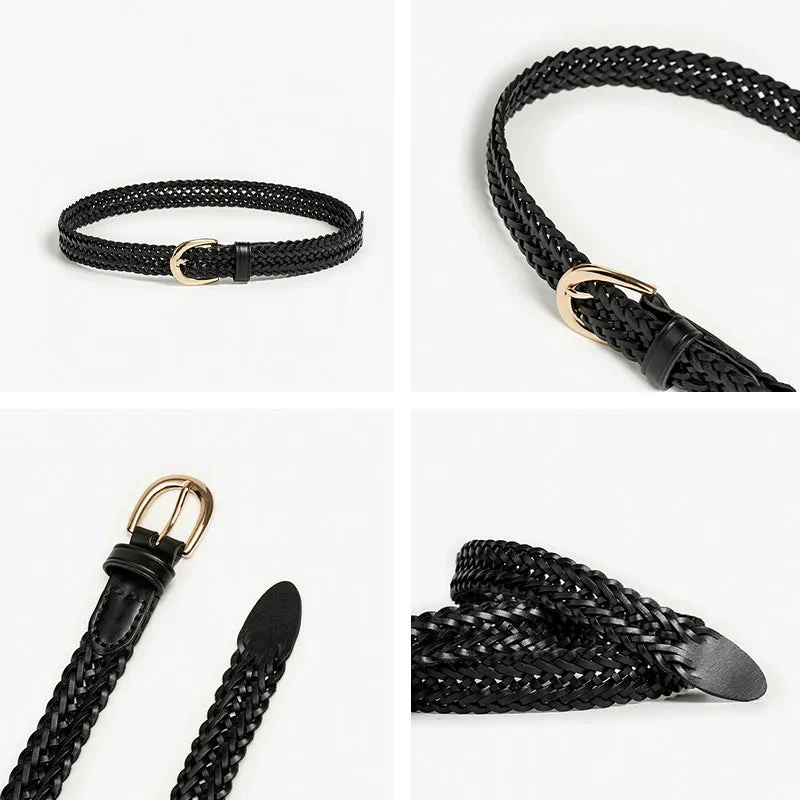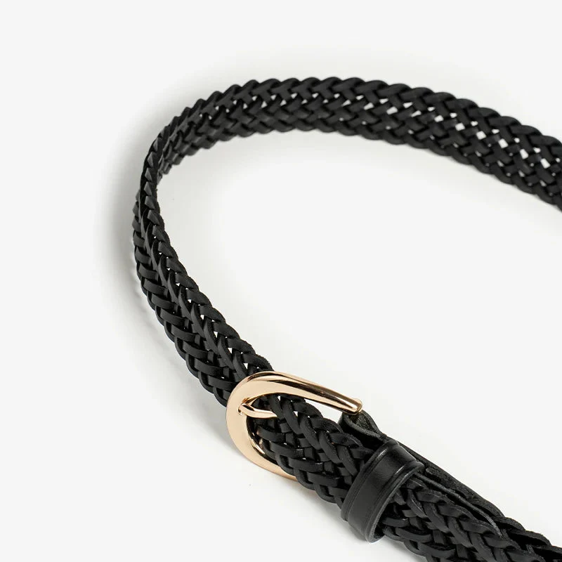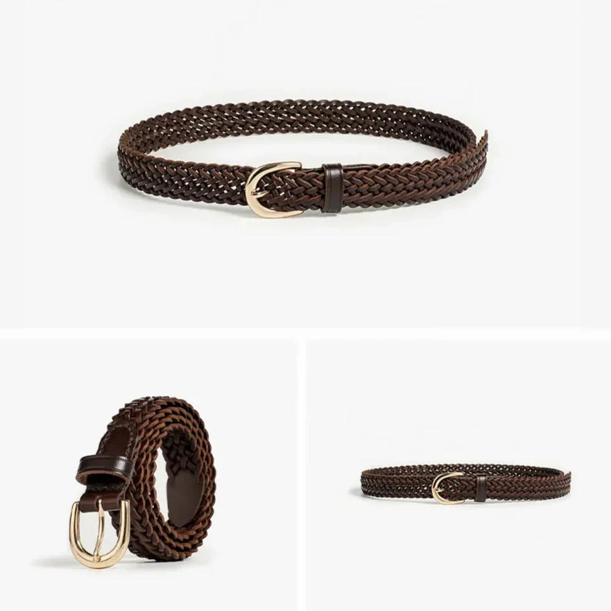 Deze stijlvolle riem met een ingewikkeld gevlochten ontwerp voegt een vleugje luxe toe aan elke outfit. De gouden metalen hardware biedt een prachtig contrast met het rijke leer, waardoor deze riem een must-have accessoire is.
